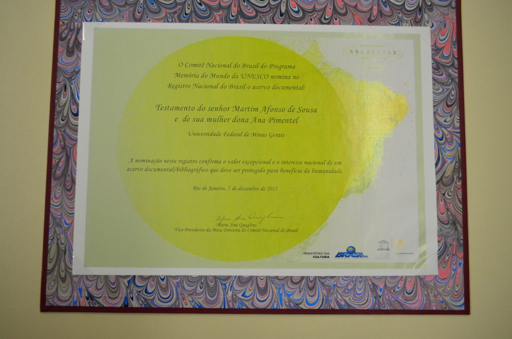 O Testamento de Martim Afonso e Dona Ana Pimentel, pertencente à Divisão de Coleções Especiais e Obras Raras da BU, foi um dos acervos escolhidos para receber o certificado da Unesco. Datado de 1533, e um dos poucos exemplares manuscritos da “Galeria Brasiliana”, o documento trata das disposições finais de um dos primeiros exploradores e capitães donatários do Brasil, e de sua esposa Dona Ana Pimentel.