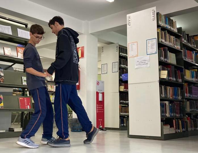 “Quando estava fazendo um tour pelo Colégio com os estagiários, a Cláudia nos disse que a Biblioteca estava sendo pouco utilizada pós-pandemia. E eu estava com dificuldade de achar um espaço coberto – por causa dessa época de chuva – para realizar as atividades do módulo de dança. Tivemos, então, a ideia de fazer a aula de forró lá, trazendo os alunos da turma 105 para movimentar o espaço. E a Claudia fez uma curadoria de materiais, que ficaram expostos para os interessados, sobre dança, forró e outros ritmos. A aula foi aberta. Mais de vinte alunos, incluindo estudantes de outras turmas, participaram da dinâmica”, conta o professor Marcos.