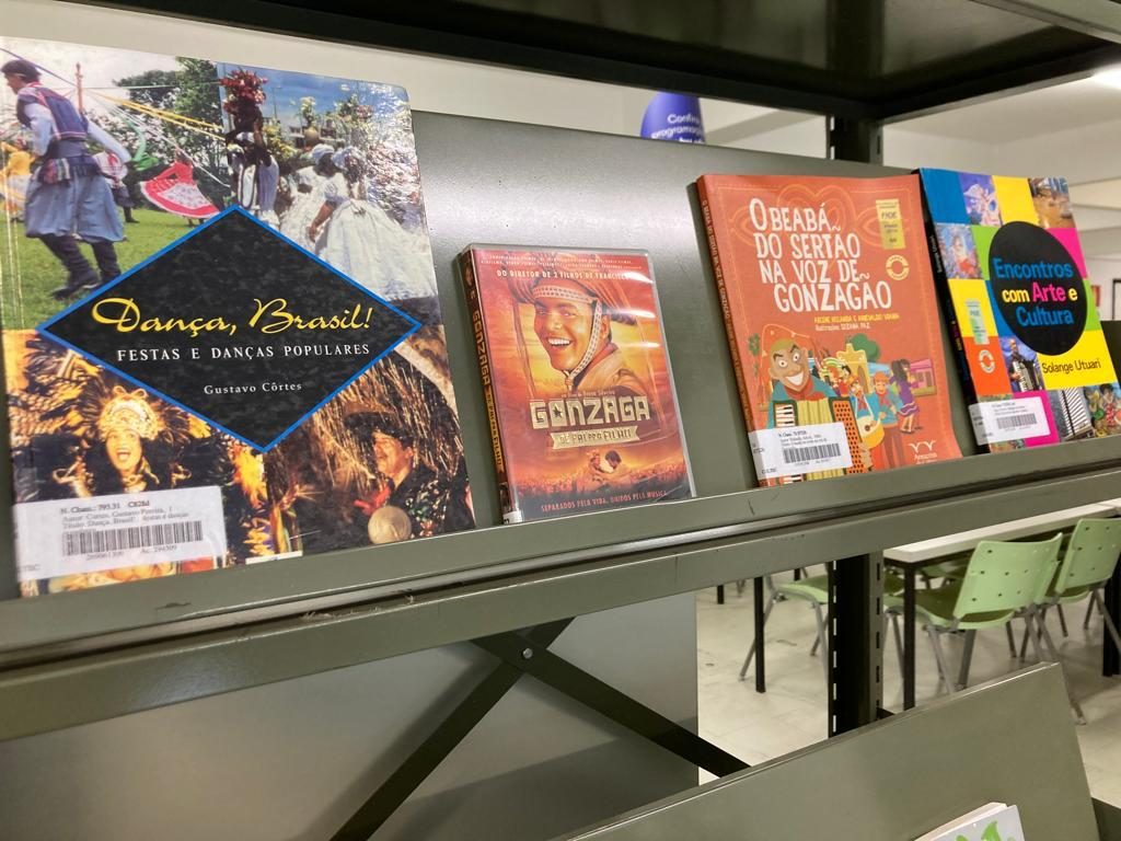 Livros sobre forró e dança estão expostos na Biblioteca para quem quiser ler mais sobre a temática. Foto: Carla Pedrosa / Biblioteca Universitária UFMG