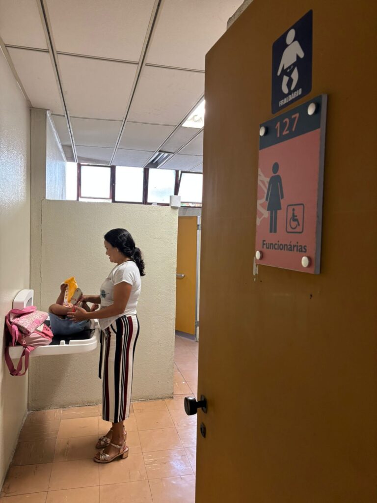 “Em alguns dias das férias, as crianças me acompanham aqui no trabalho. Eu as levo para ler e brincar no Espaço de Leitura. Ter um trocador de fralda na biblioteca facilita a vida de nós, mães e pais, garantindo dignidade tanto para os cuidadores, quanto para nossas crianças e bebês, além de transmitir uma imagem positiva e acolhedora da Instituição”, afirma Flávia Abreu, servidora da BC.