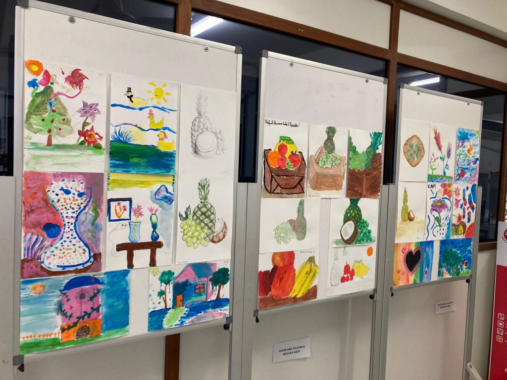 Entre os trabalhos expostos estão pinturas coletivas e desenhos de observação. Foto: Carla Pedrosa/Biblioteca Universitária UFMG