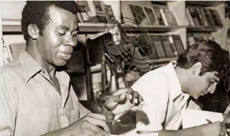 Escritor Adão Ventura autografa ‘Abrir-se um abutre ou mesmo depois de deduzir dele o azul’, ao lado do também escritor Jaime Prado Gouvea, que lançou’ Areia tornando em pedra’, na Livraria Modelo, em 1970. Foto: Arquivo Jornal Estado de Minas