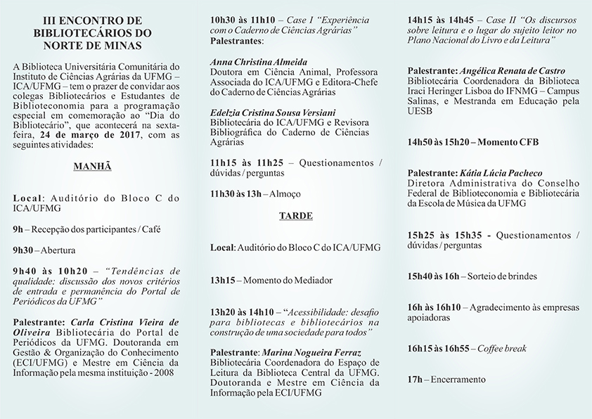 Em homenagem ao Dia do Bibliotecário, celebrado em 12 de março, a Biblioteca Universitária Comunitária do Instituto de Ciências Agrárias (ICA) realizará a terceira edição do Encontro dos Bibliotecários do Norte de Minas.