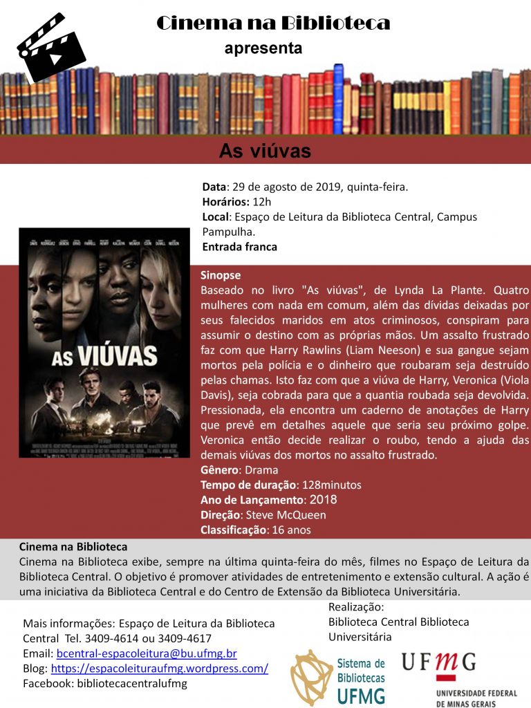 O Cinema na Biblioteca exibe o filme “As Viúvas”, na quinta-feira, dia 29 de agosto, no Espaço de Leitura da Biblioteca Central, Campus Pampulha. A entrada é franca, e o objetivo é promover atividades de entretenimento e extensão cultural. A ação é uma iniciativa da Biblioteca Central e do Centro de Extensão da Biblioteca Universitária.