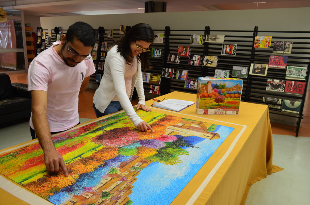 Atividade recreativa, exercício de concentração e trabalho em equipe, a montagem coletiva de quebra-cabeças fez sucesso nas bibliotecas da UFMG. No início deste ano, um jogo de encaixes de oito mil peças foi montado na Biblioteca do Departamento de Física, por centenas de colaboradores, em aproximadamente dois meses. E recentemente, com quatro mil e duas peças, o quebra-cabeça do Espaço de Leitura da Biblioteca Central foi finalizado em quinze dias úteis e contou com a participação de mais de cem pessoas na montagem. Entre os colaboradores, estavam Fernando Pereira, estudante do curso de matemática, e Caroline Mendes, aluna do curso de administração.