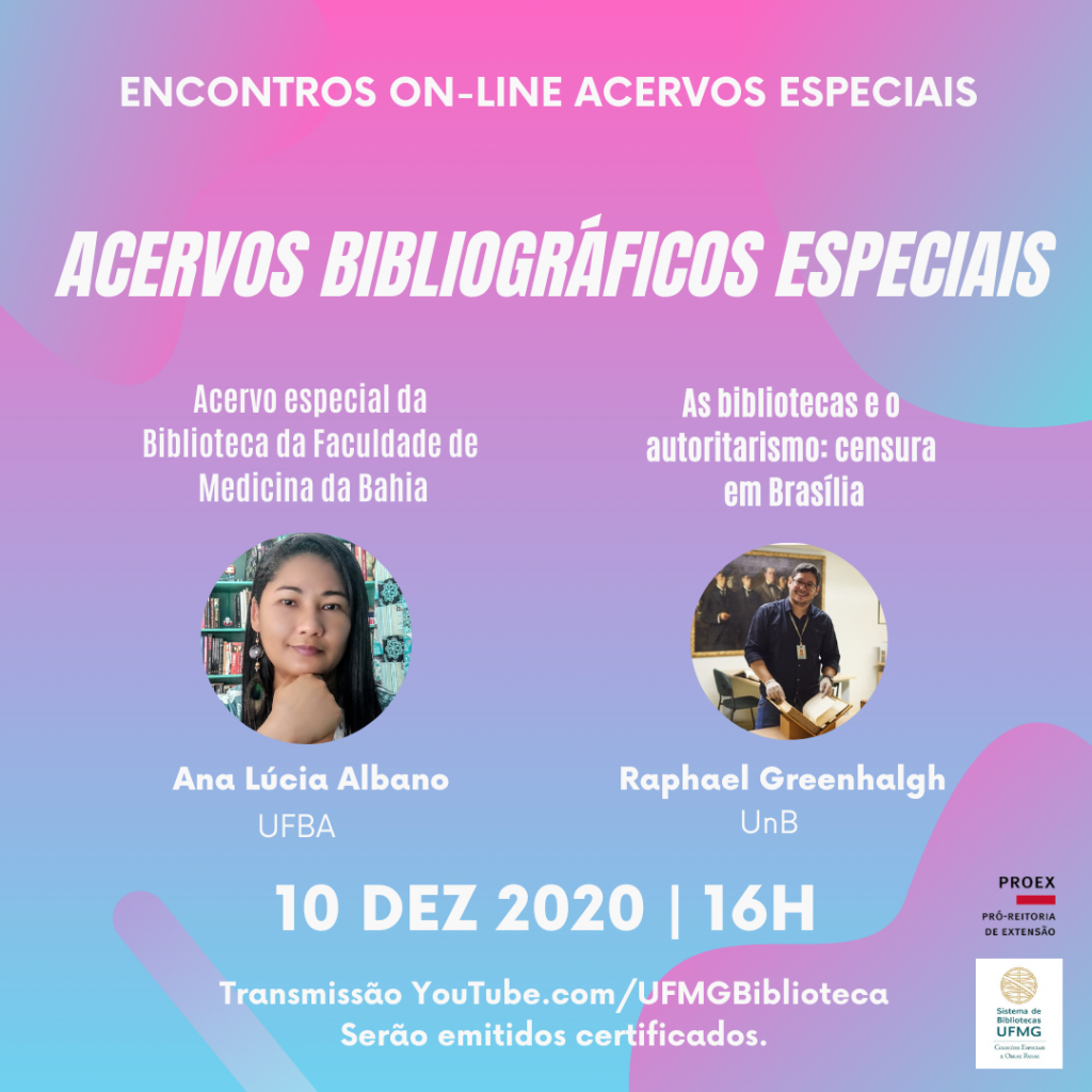 Acontece nesta quinta-feira (10), às 16h, a penúltima palestra deste ano dos Encontros On-line dos Acervos Especiais. A transmissão no canal do YouTube UFMG Biblioteca é aberta ao público e são emitidos certificados aos participantes.
