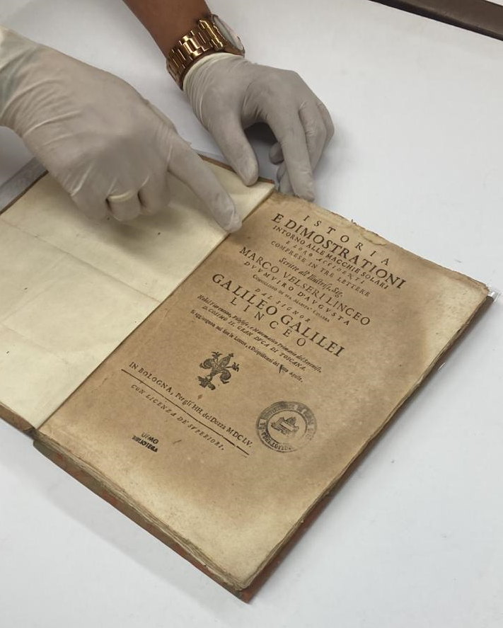 Livro de Galileu Galilei, datado de 1655, é um dos mais antigos da Divisão de Coleções Especiais e Obras Raras. Foto: Carla Pedrosa/ Biblioteca Universitária UFMG
