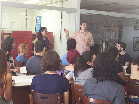 Nesta quinta-feira (07), o professor Amir Brito, da Escola de Belas Artes, ministrou uma aula na Dicolesp sobre a Coleção de Livros de Artista. Nesse acervo é possível encontrar itens raros, como o primeiro Livro de Artista produzido no Brasil, em 1967, por Álvaro de Sá, e um dos treze únicos exemplares do livro Sumaré, do artista Alex Flemming, que se destaca pelas fotografias e pela grandeza.