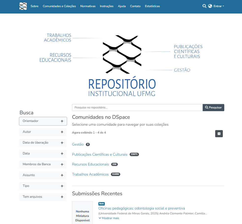 Nova interface do Repositório Institucional da UFMG facilita o acesso às comunidades, às pesquisas e disponibiliza as submissões recentes na tela inicial. Imagem: reprodução do site