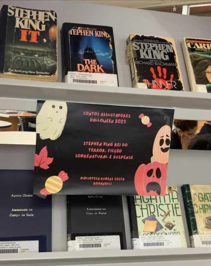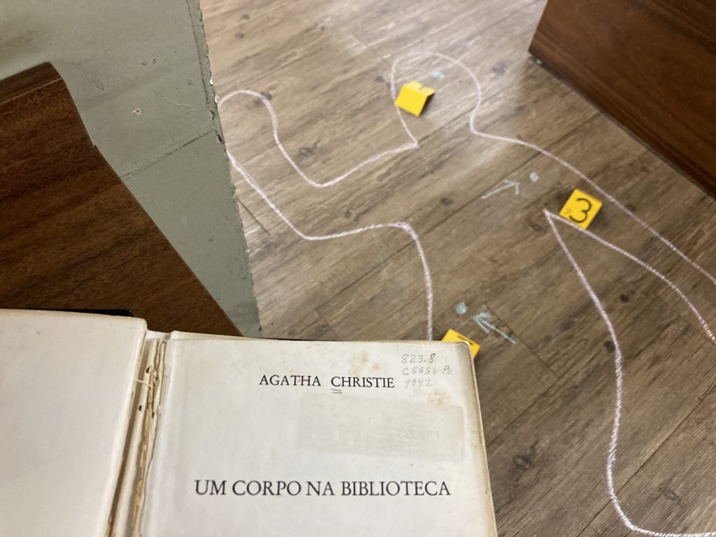 ‘Um Corpo na Biblioteca’, clássico de Agatha Christie, constitui parte da cena de um crime na Biblioteca da Faculdade de Letras (Fale). No local, também é possível conferir uma teia investigativa com os principais suspeitos e, para ampliar o clima de mistério, uma mostra de contos assustadores com destaque, entre outros autores, para obras de Agatha Christie e Stephen King, descrito como rei do terror, ficção sobrenatural e suspense. A proposição dessa atividade lúdica partiu dos próprios estagiários da Biblioteca da Fale e contou com o apoio dos bibliotecários.
