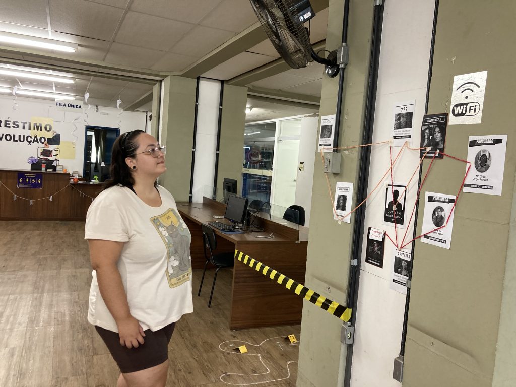 “A partir da proposta da exposição dos contos assustadores, outras ideias foram surgindo, inspiradas na decoração de dia das bruxas da Biblioteca da Escola de Ciência da Informação. Laura Fiúza, uma das estagiárias, sugeriu desenhar um corpo no chão, simulando a cena de um crime. Rapidamente outra colaboradora, Renata Santos, que é entusiasta de histórias de investigação, propôs a montagem do quadro de suspeitos, posteriormente produzido por mim. As criações da mostra e do cenário investigativo se encaixaram perfeitamente e o retorno dos estudantes tem sido muito positivo. Tanto presencialmente, quanto nas redes sociais, demostram interesse pelos autores presentes na exposição, elogiam a decoração e dão palpites sobre o ‘assassino misterioso’. O nome dele será revelado, tanto na Biblioteca, quanto via rede social, logo após o dia das bruxas”, conta a bibliotecária Adrieli Jacinto.
