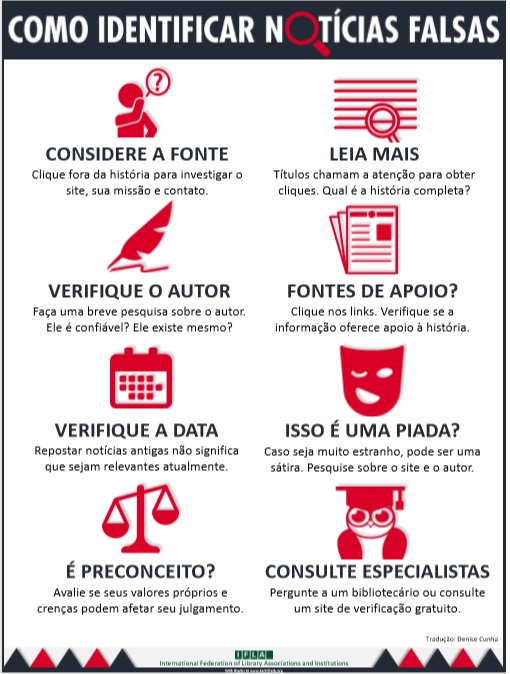 As recentes discussões sobre notícias falsas – fake news – tem reforçado a necessidade de se pensar o papel das bibliotecas – e de outras instituições – na formação de pessoas aptas a lidarem com a informação de maneira crítica e responsável. A Federação Internacional de Associações e Instituições Bibliotecárias (IFLA) aponta que o papel dos profissionais que atuam nessas organizações é, justamente, “educar e defender o pensamento crítico – uma habilidade crucial quando se navega na sociedade da informação”. Pensando nisso, a IFLA elaborou um infográfico, traduzido para mais de trinta idiomas, informando oito passos para descobrir a veracidade de uma notícia.