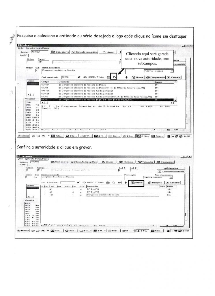 Orientação para inserção de eventos e series no RBM 1) EVENTOS: Eventos que entram diretamente pelo seu nome: Exemplo: Seminário Nacional de Bibliotecas Universitária Ao pesquisar o evento na base tela ” cadastro” nome autoridade”, somente o conteúdo do código de subcampo $a deve ir para o RBM. Os demais subcampos $n $d $e $c deverão ser incluídos diretamente no RBM. Eventos que entram de forma subordinada a um nome de entidade: Exemplo: American Chemical Society. National Meeting Ao pesquisar o evento na base tela ” cadastro” nome autoridade”, somente o conteúdo do código de subcampo $a deve ir para o RBM. Os demais subcampos $n $d $c $c deverão ser incluídos diretamente no RBM. 2) SERIES: Campo 440 – Titulo de serie Ao pesquisar o evento na base tela ” cadastro” nome autoridade”, somente o conteúdo do código de subcampo $a $n $p devem ir para o RBM. O código de subcampo $v deve ser incluído diretamente no RBM. Campo 830 – entrada secundaria de serie – titulo uniforme Ao pesquisar o evento na base tela ” cadastro” nome autoridade”, somente o conteúdo do código de subcampo $a devem ir para o RBM. O código de subcampo $v deve ser incluído diretamente no RBM. Quando a serie e/ ou evento pesquisada estiver com subcampos, importar autoridade do CD FGV, caso não encontre criar uma temporária, seguindo metodologia abaixo: |