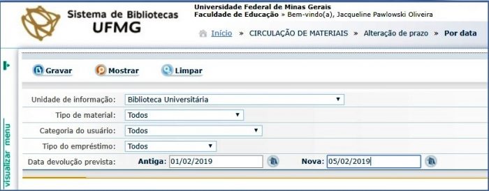 >> CIRCULAÇÃO DE MATERIAIS » Alteração de prazo » Por data. Ou por exemplar quando for o caso.
