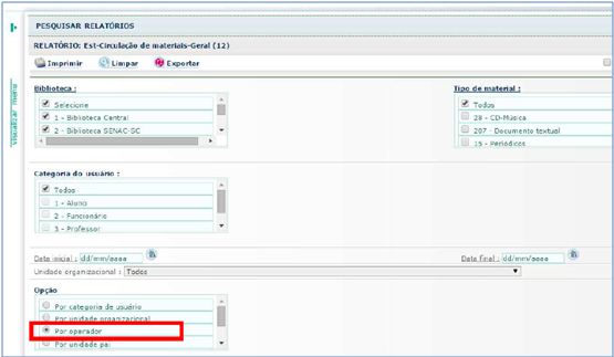 - Selecionar as opções: Biblioteca, Tipo de material, Categoria do usuário, Datas e Por operador;