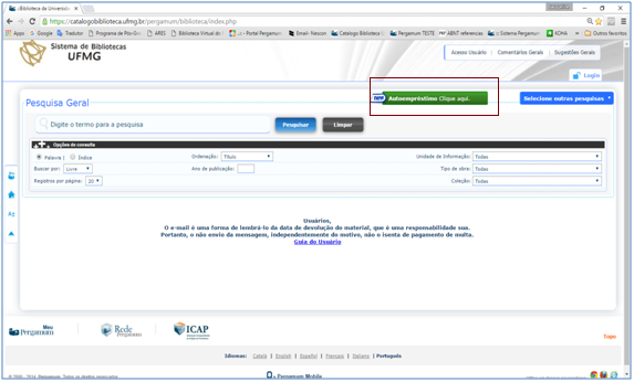 1. Acesse o site do Catálogo online pelo endereço https://catalogobiblioteca.ufmg.br
