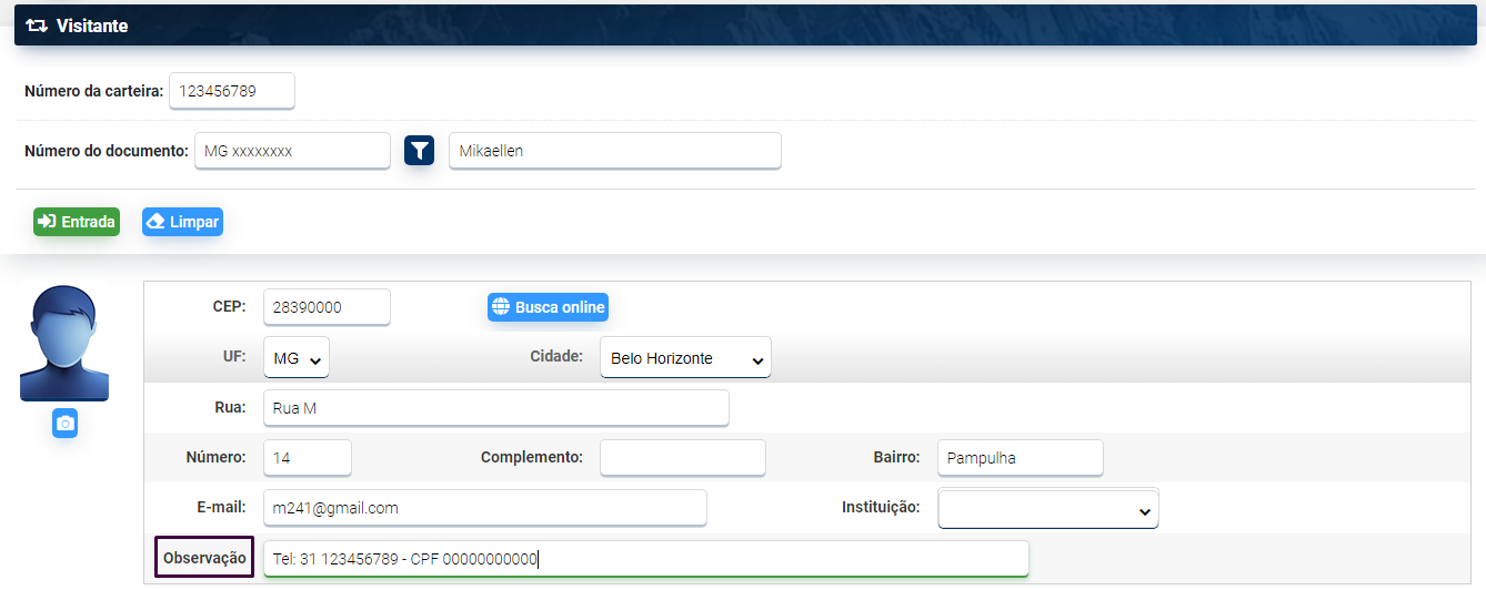– Preencha o campo observação com telefone e CPF do visitante. (Se necessário )