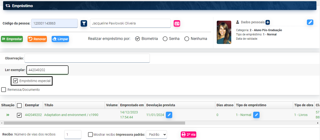 - A tela de empréstimo especial abre automaticamente caso o usuário possua algumas restrição ou quando o exemplar tiver alguma configuração de situação, tipo de empréstimo que só é possível emprestar nesta modalidade.
