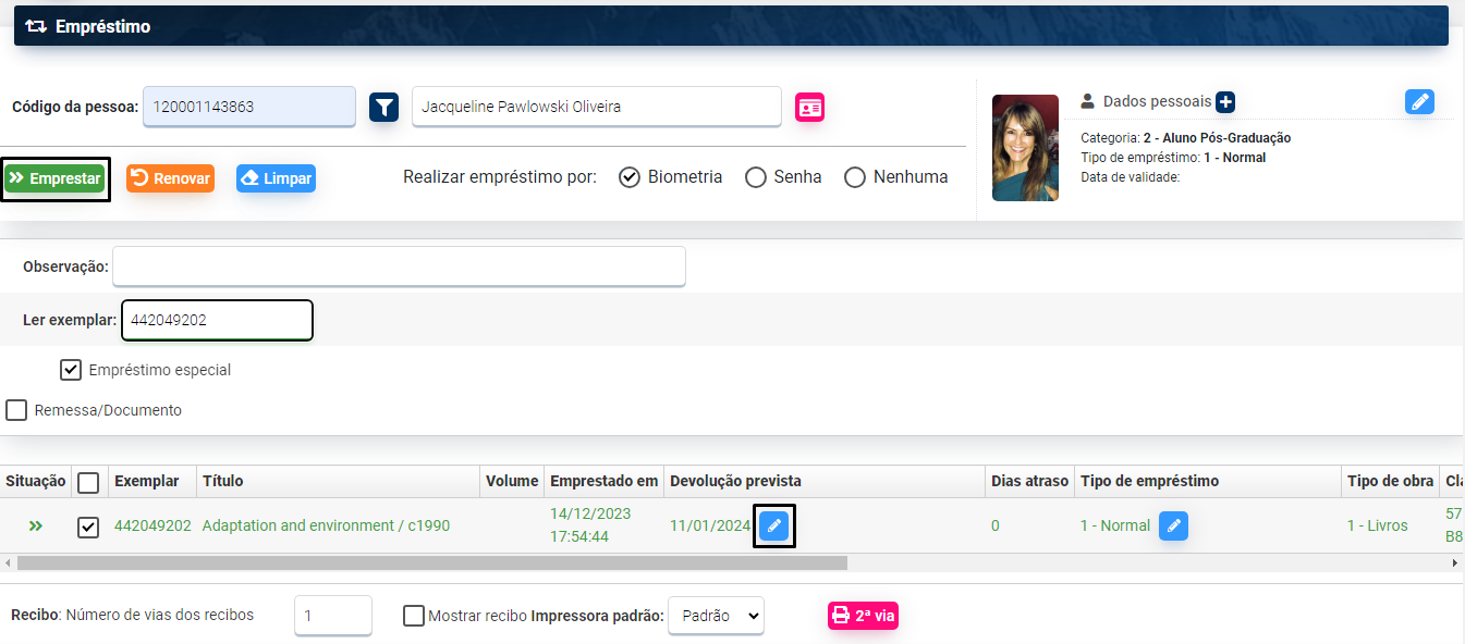 – Na tela que se abrirá, clique no ícone do Lápis ao lado da Data de Devolução para determinar nova data de devolução;