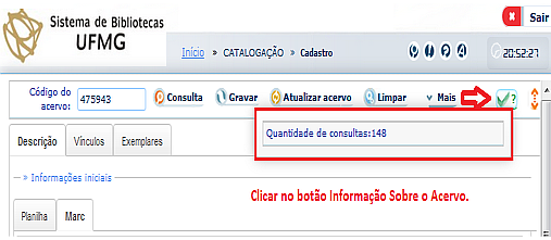 No módulo de Catalogação > Cadastro > Acervo Geral, será indicada a quantidade de consultas locais realizadas ao título.