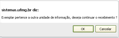 Atenção: Neste campo o sistema faz o recebimento do exemplar mesmo ele sendo de outra biblioteca. Apenas exibe mensagem de alerta: